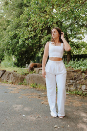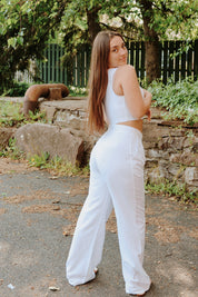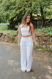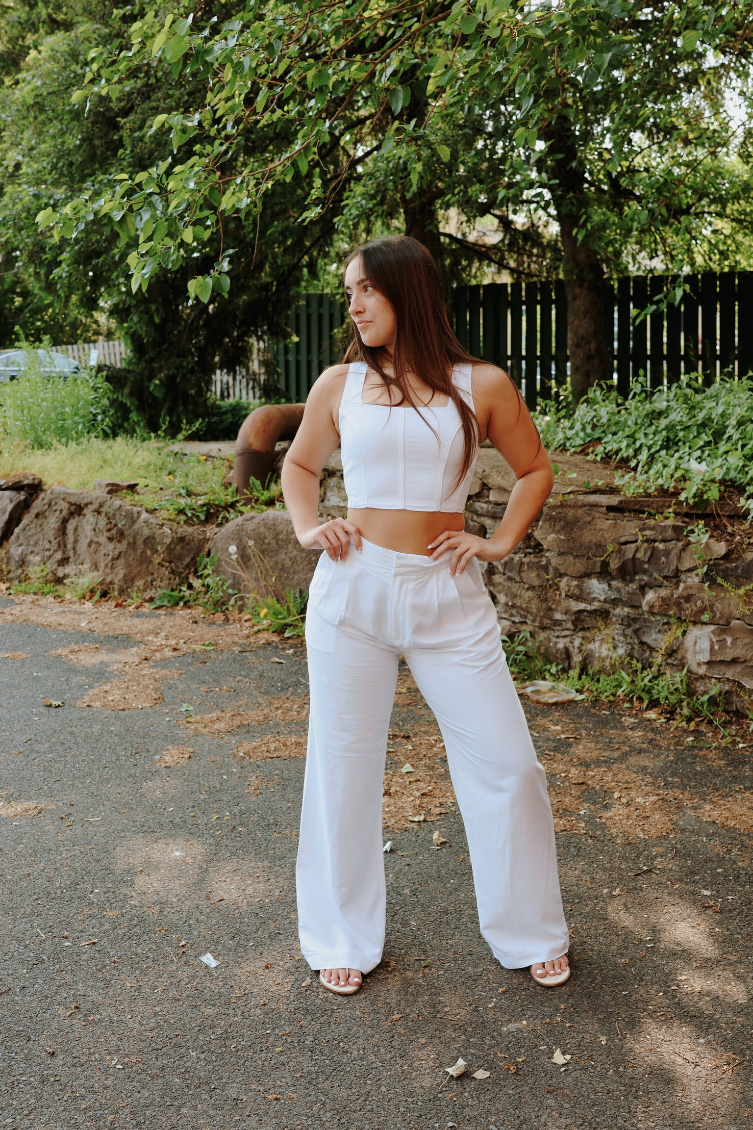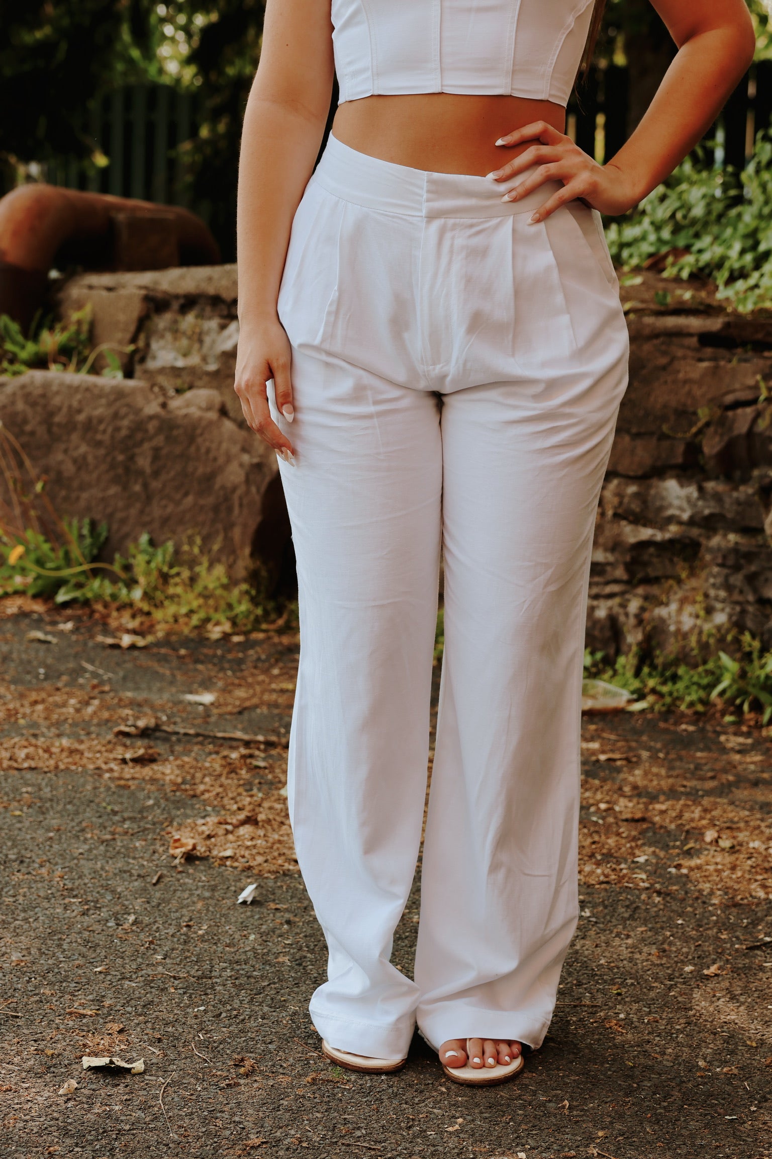 A high waistband and front pleating contribute to the overall tailored look of the ISABELLA wide leg pants.