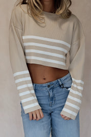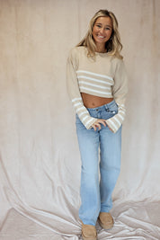 Soft crewneck sweater with stripe detail and flare sleeves.