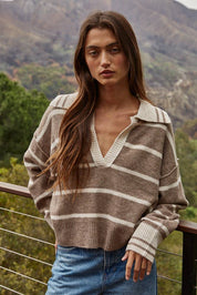 Knit Sweater Acrylic Polyester Spandex Striped Collar V-Neck Long Sleeve Top