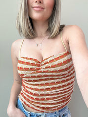 Made for warm-weather outfitting, this textured top features a slim-fitting silhouette and chic sweetheart-neckline with ruched bust detail and thin adjustable shoulder straps.