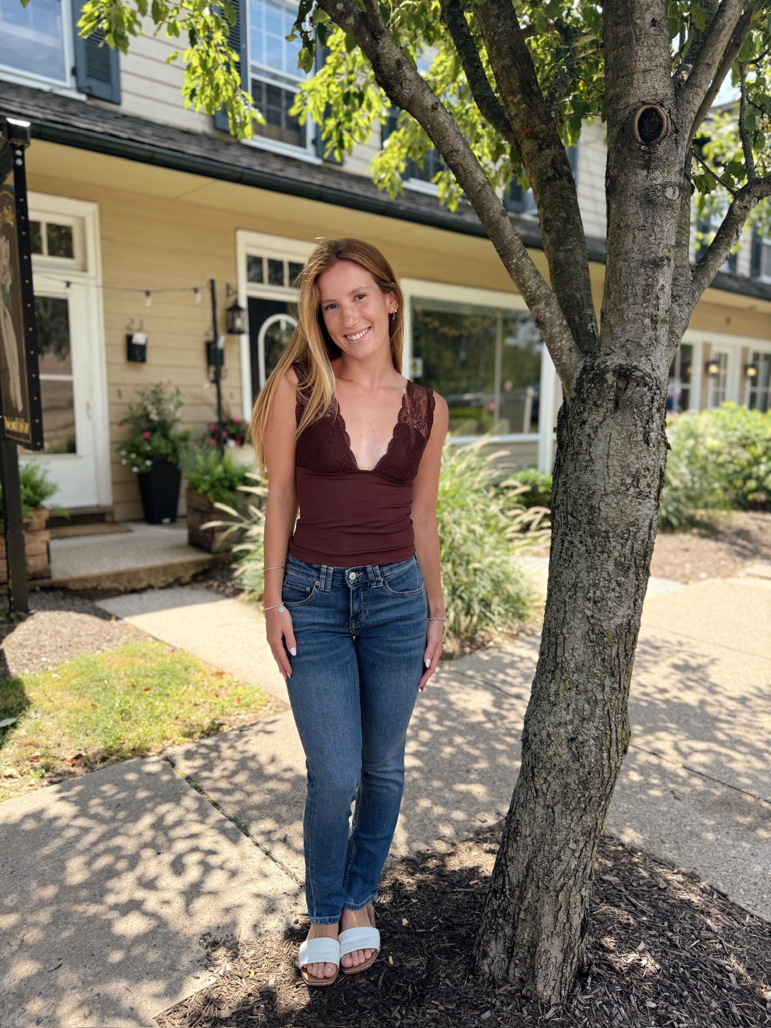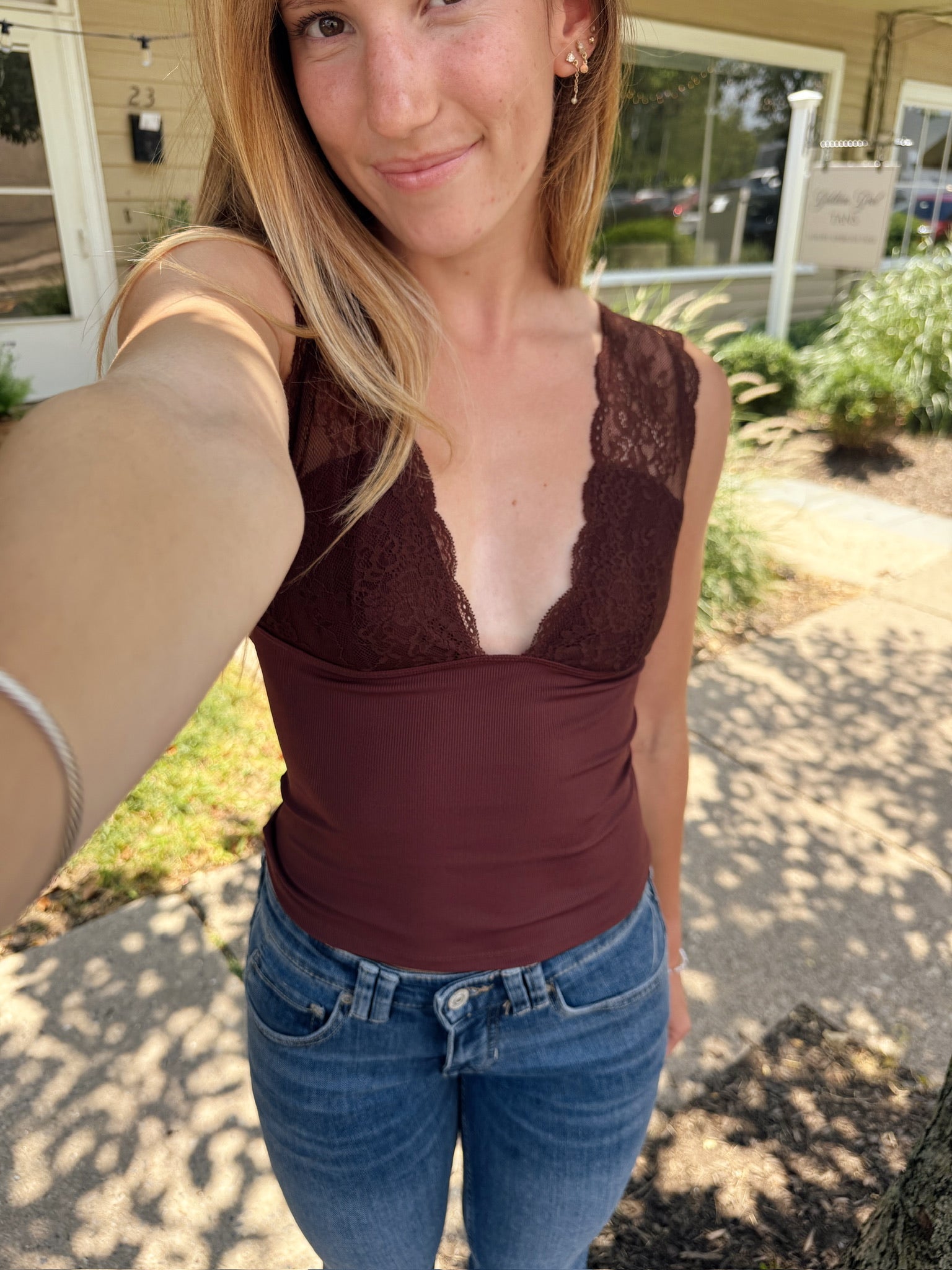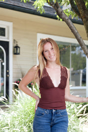 Classic and femme, this sweet cami features a lace-adorned plunge neckline and ribbed bodice in a slim, cropped silhouette.