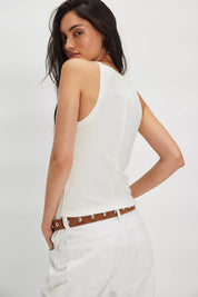Features: High square neckline, dropped armholes, soft ribbed fabrication