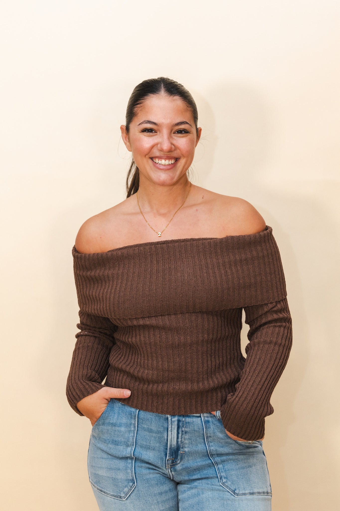 Off the shoulder fold over knit long sleeve full length sweater top.