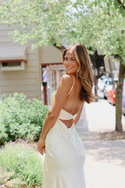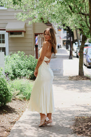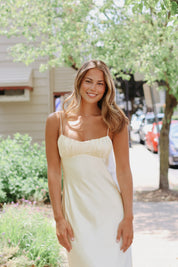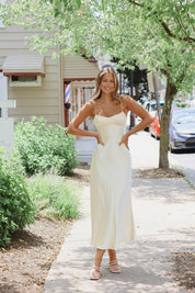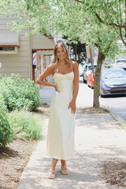 Gorgeous light yellow satin maxi dress with ruched bodice, adjustable straps, and twist in the back.