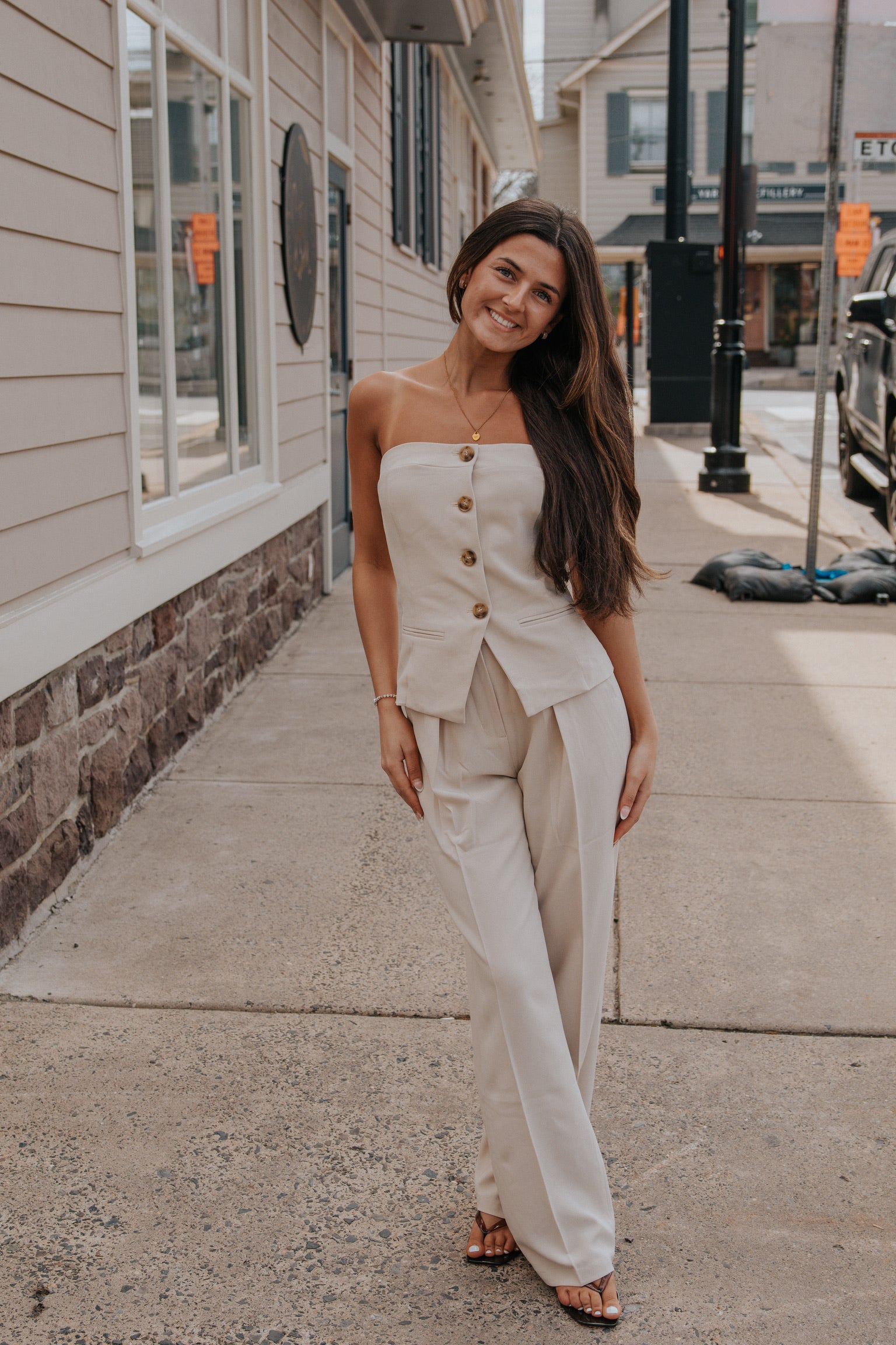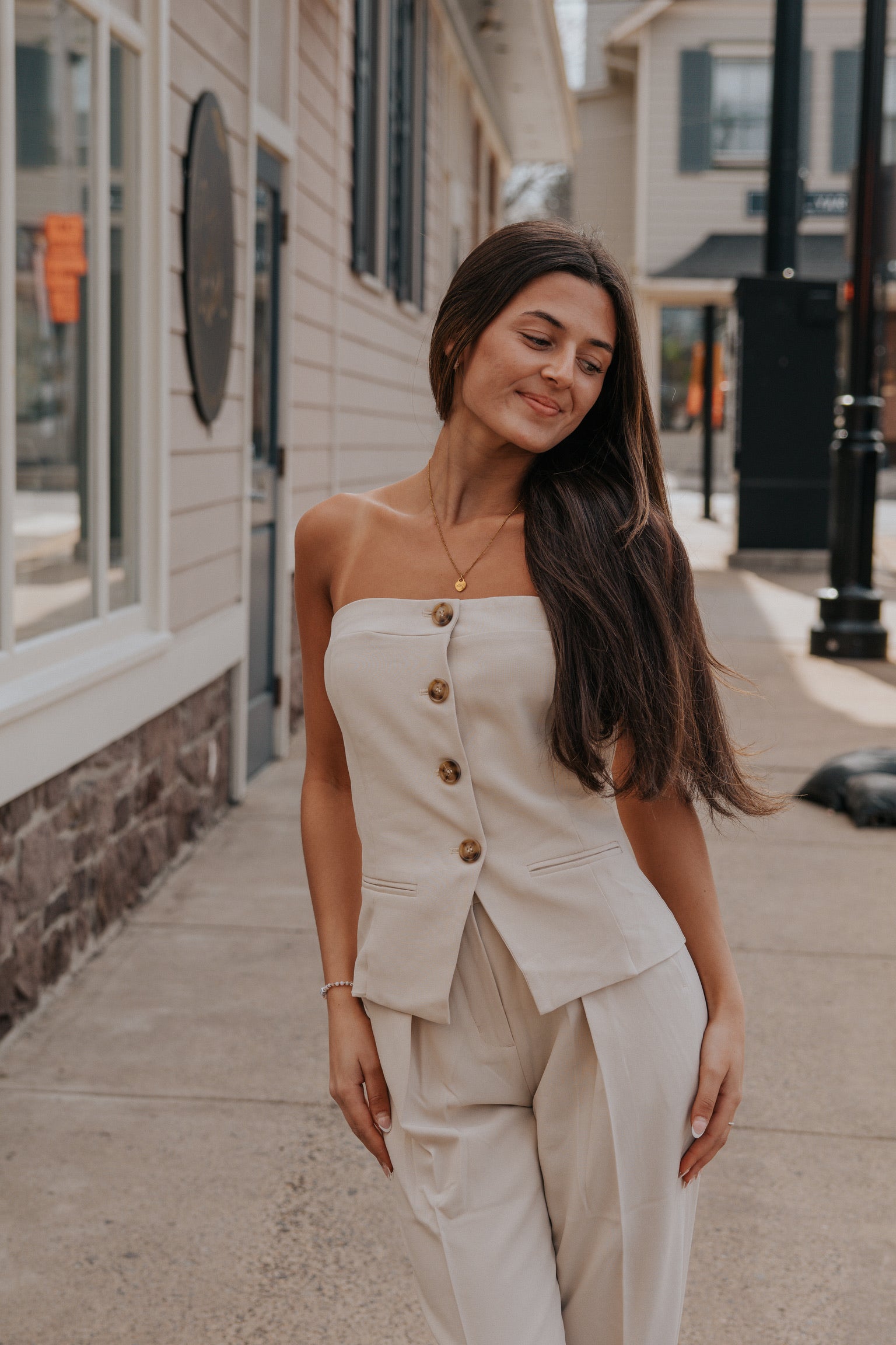 Strapless blazer style top featuring welt pockets, tortoise shell buttons and elasticated back for extra support. Fully lined.